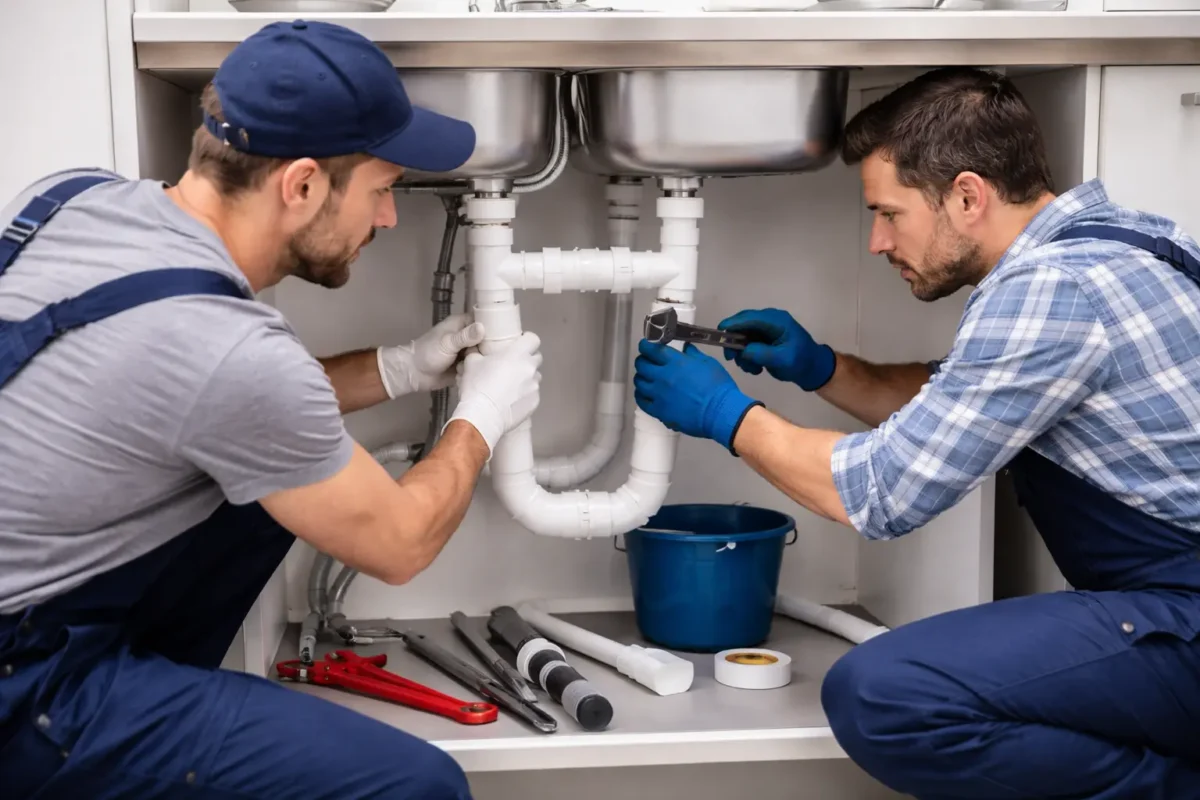 Professional workers installing drain plumbing for a kitchen sink setup in a modern kitchen